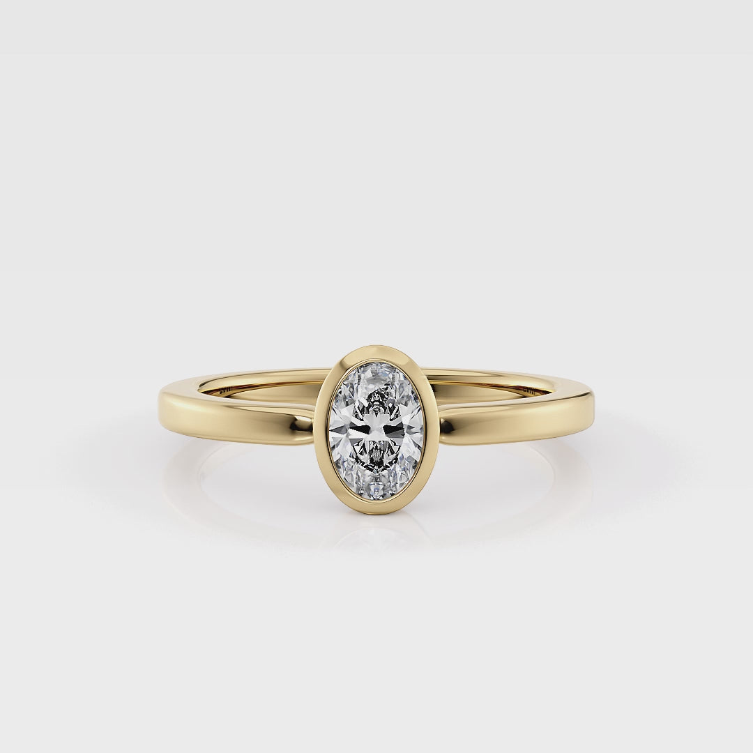 This minimalistic bezel set solitaire engagement ring showcase a beautiful oval diamond center.