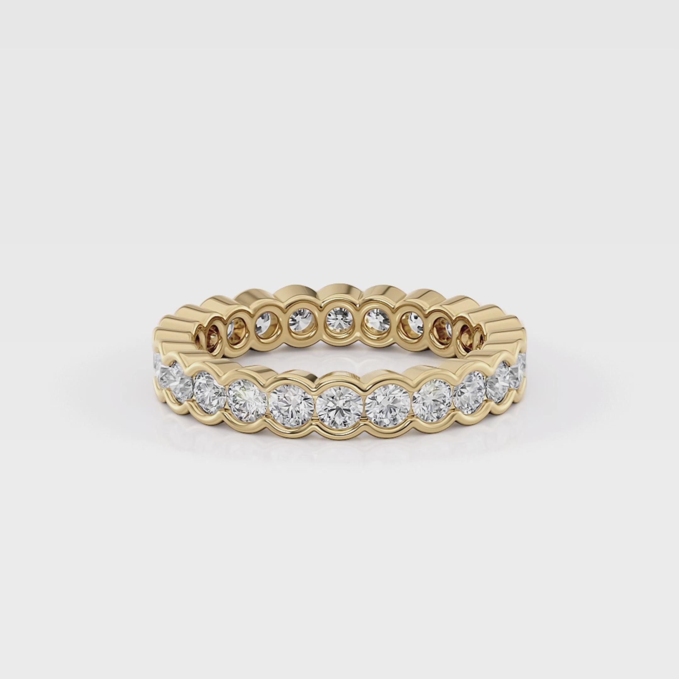 This diamond eternity wedding band boasts a sleek and sophisticated bezel set design, exuding timeless elegance and style.