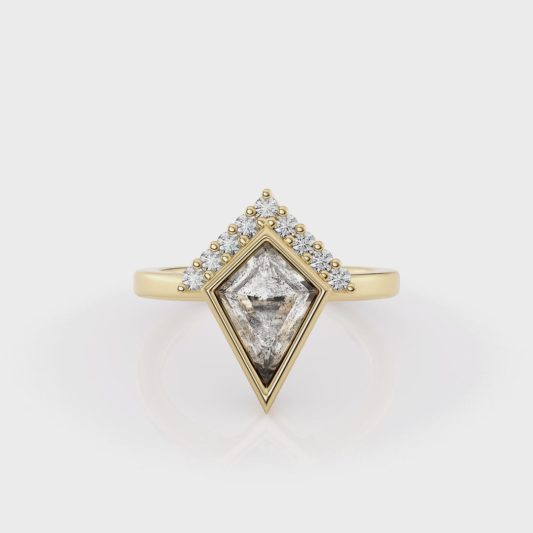 Embark on a journey of timeless elegance with our Nomadic Nostalgia collection, featuring vintage-inspired salt and pepper diamond rings. Introducing the The Kite Ring, a masterpiece of ethically sourced luxury and art deco charm. Adorned with a Kite shaped diamond and a diamond crown, it exudes sophistication and allure. Crafted with conscious elegance in mind, each ring reflects our commitment to ethical sourcing and exquisite design. Elevate your love story with theThe Kite Ring a symbol of your enduring bond and refined taste. Immerse yourself in the nostalgia of bygone eras while embracing the elegance of modern ethical craftsmanship.