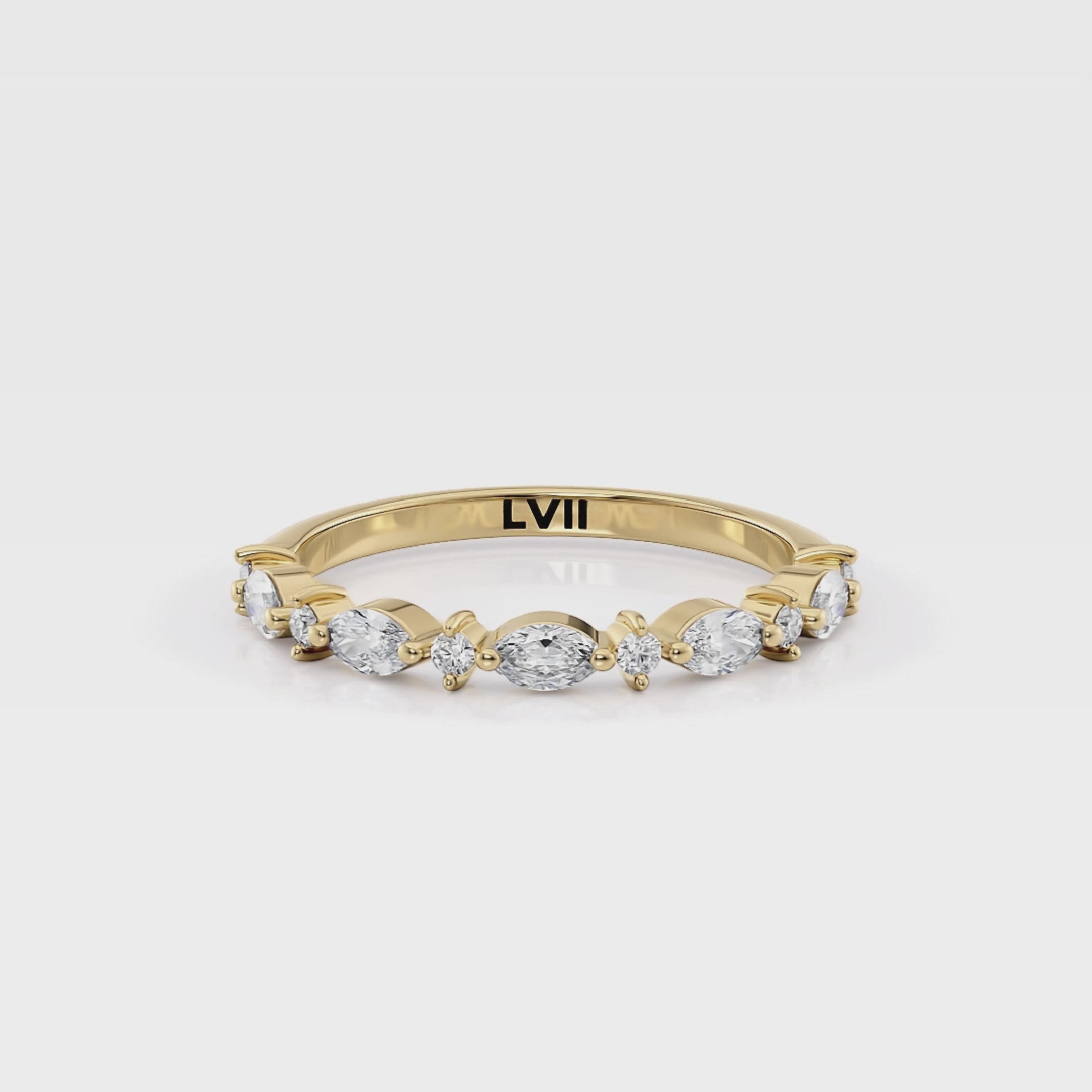 Introducing The Alexandria– Our diamond wedding bands boast a dainty and vintage-inspired design, featuring a mix of marquise diamond and round-cut diamonds that create a mesmerizing display of sparkle and shine.