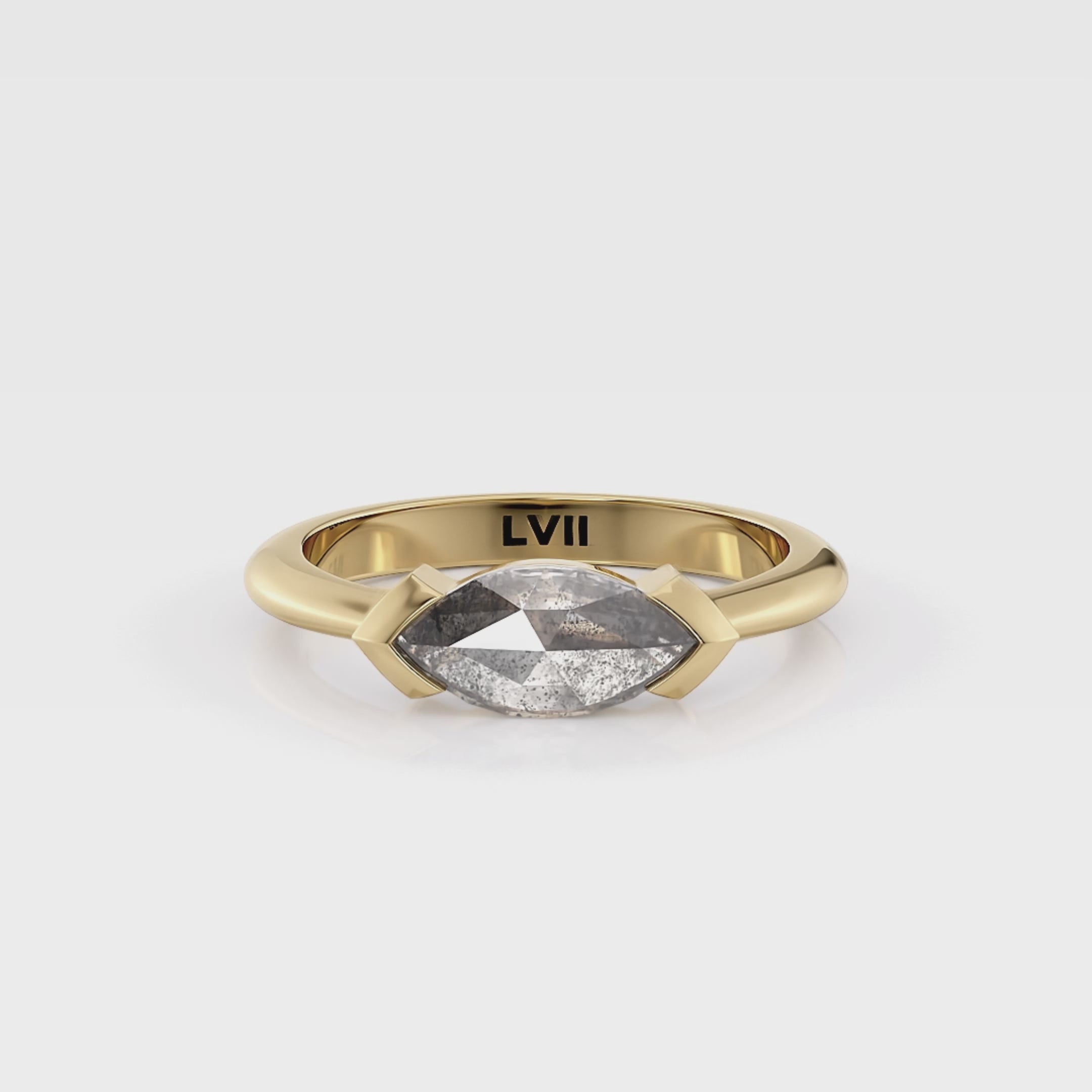 Experience the enchanting allure of our Radiant Reverie collection, showcasing vintage salt and pepper diamond engagement rings. Introducing the "Rosemary Ring," a captivating blend of ethical craftsmanship and unique charm. Featuring an east-west setting and a stunning solitaire marquise rose cut diamond, it exudes timeless elegance and individuality. Crafted with meticulous care and ethically sourced diamonds, each ring in our collection is a symbol of conscious luxury and enduring beauty. Elevate your love story with the "Rosemary Ring," a testament to your values and your appreciation for the extraordinary. Indulge in the enchantment of vintage-inspired design with a ring that radiates sophistication and timeless allure.