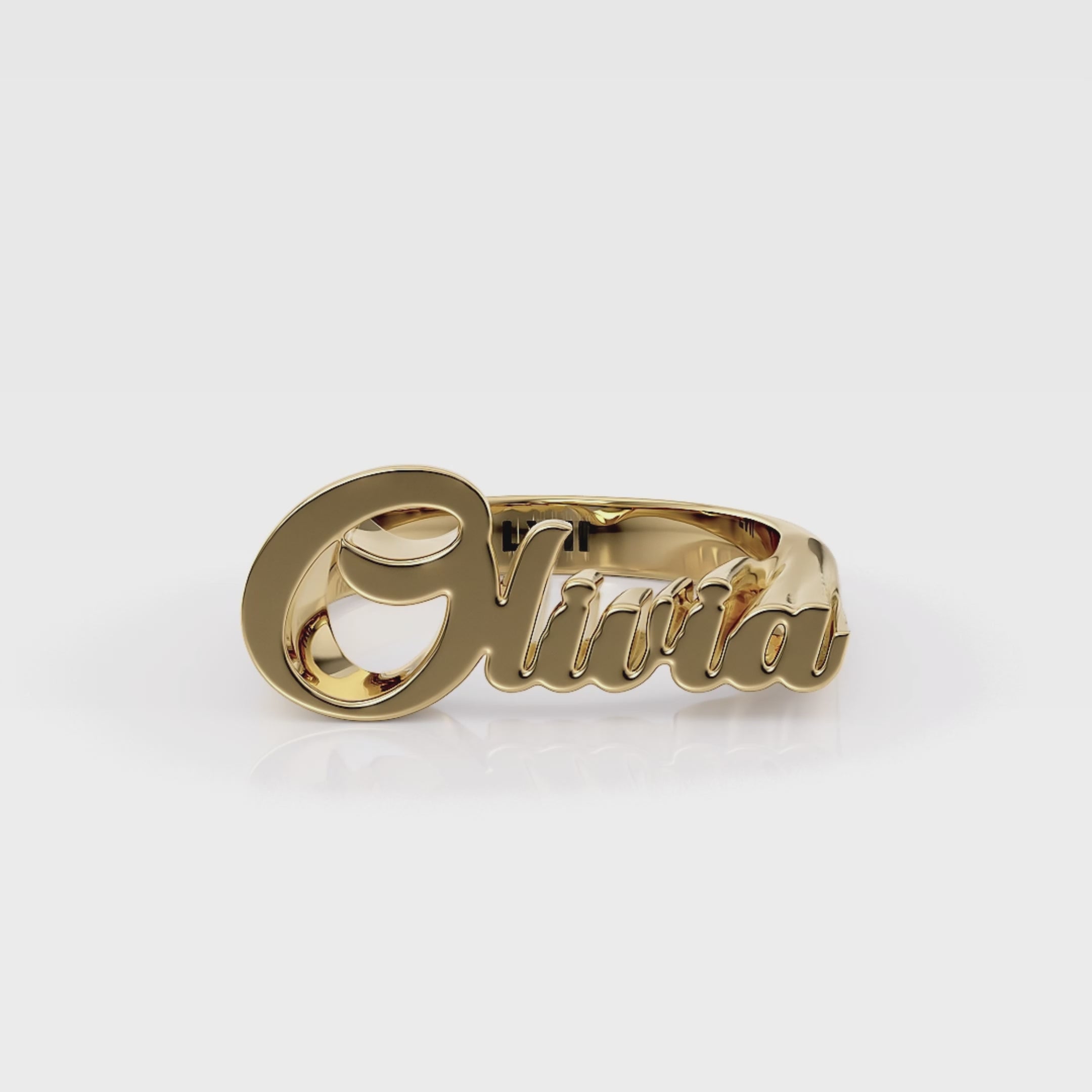 Introducing our elegant script name ring, a timeless piece that adds a personal touch to your style. Crafted with meticulous attention to detail, each ring features your chosen name beautifully scripted in a sophisticated font. Whether it's your own name or that of someone special, this ring serves as a unique expression of identity and individuality. Made with high-quality materials and expert craftsmanship, it exudes elegance and sophistication. Elevate your look with this personalized accessory that effortlessly combines style and sentiment.