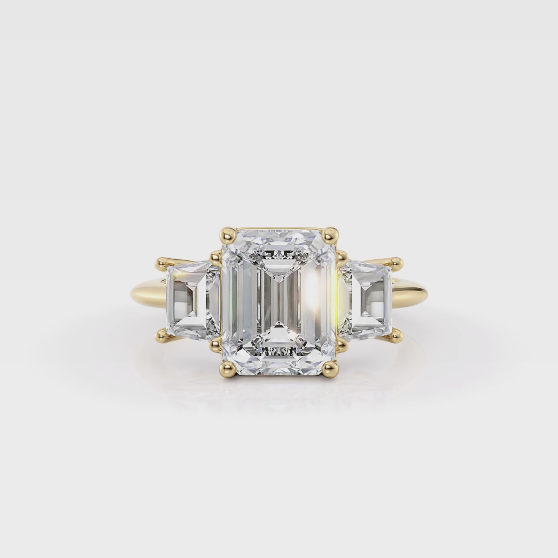 Featuring an emerald-cut center stone flanked by side trapezoid diamonds, The Celestia Ring captures the essence of vintage charm with its classic design and clean lines. Designed to sit elegantly low on the finger, this ring offers both style and comfort.