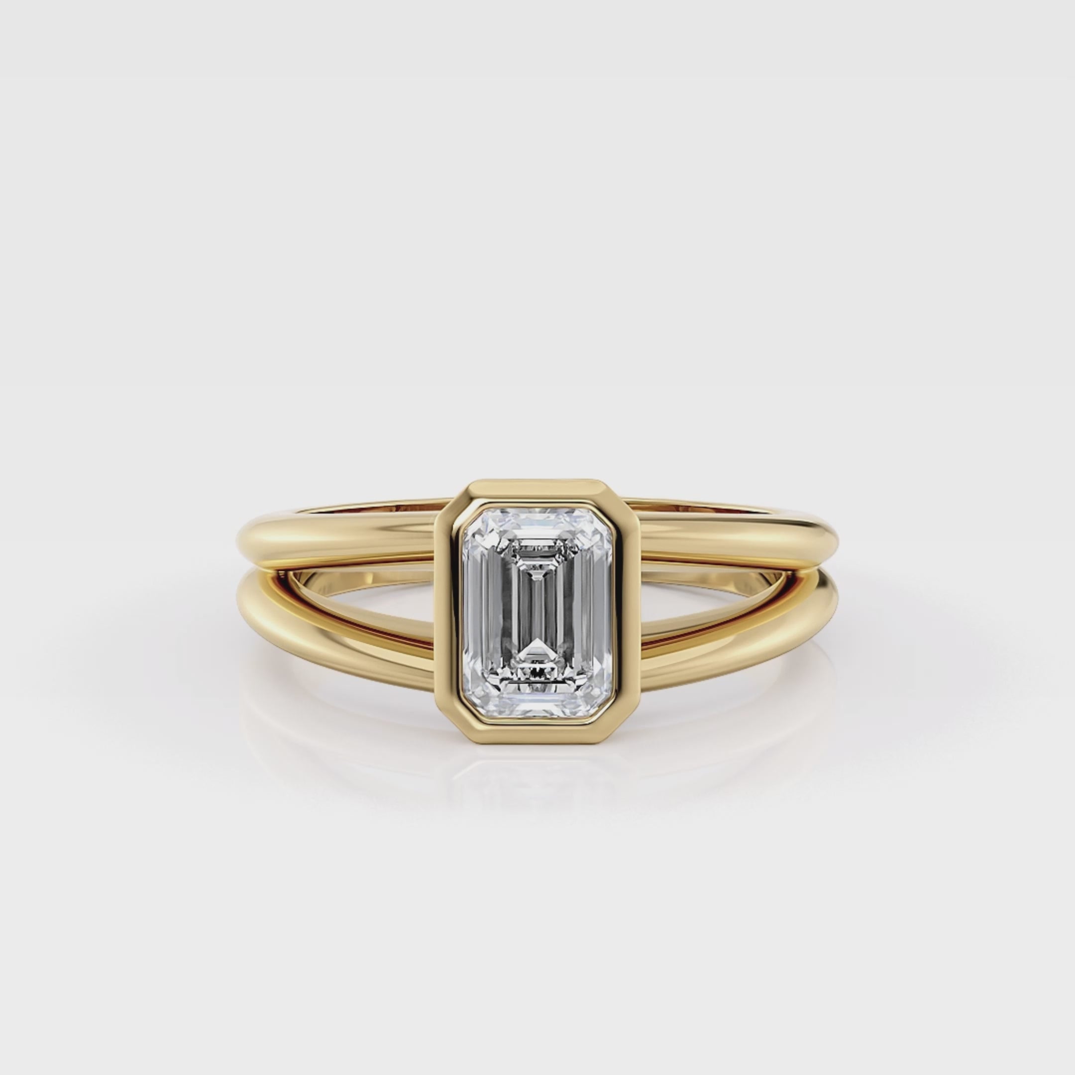 The Aurelia Ring features an exquisite emerald-cut center stone, set in a split shank solitaire design with bezel-set. With clean lines and a design that sits low to the finger, this ring exudes understated elegance and timeless charm.