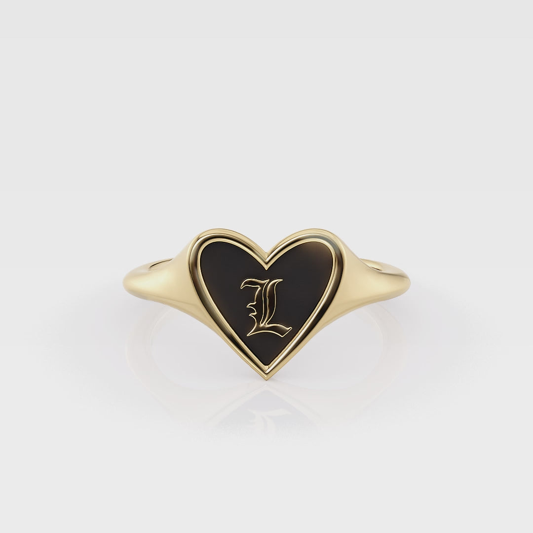 Gold Heart Signet Ring Blak Enamel Not Black Onyx Ring- Personalized Timeless Love