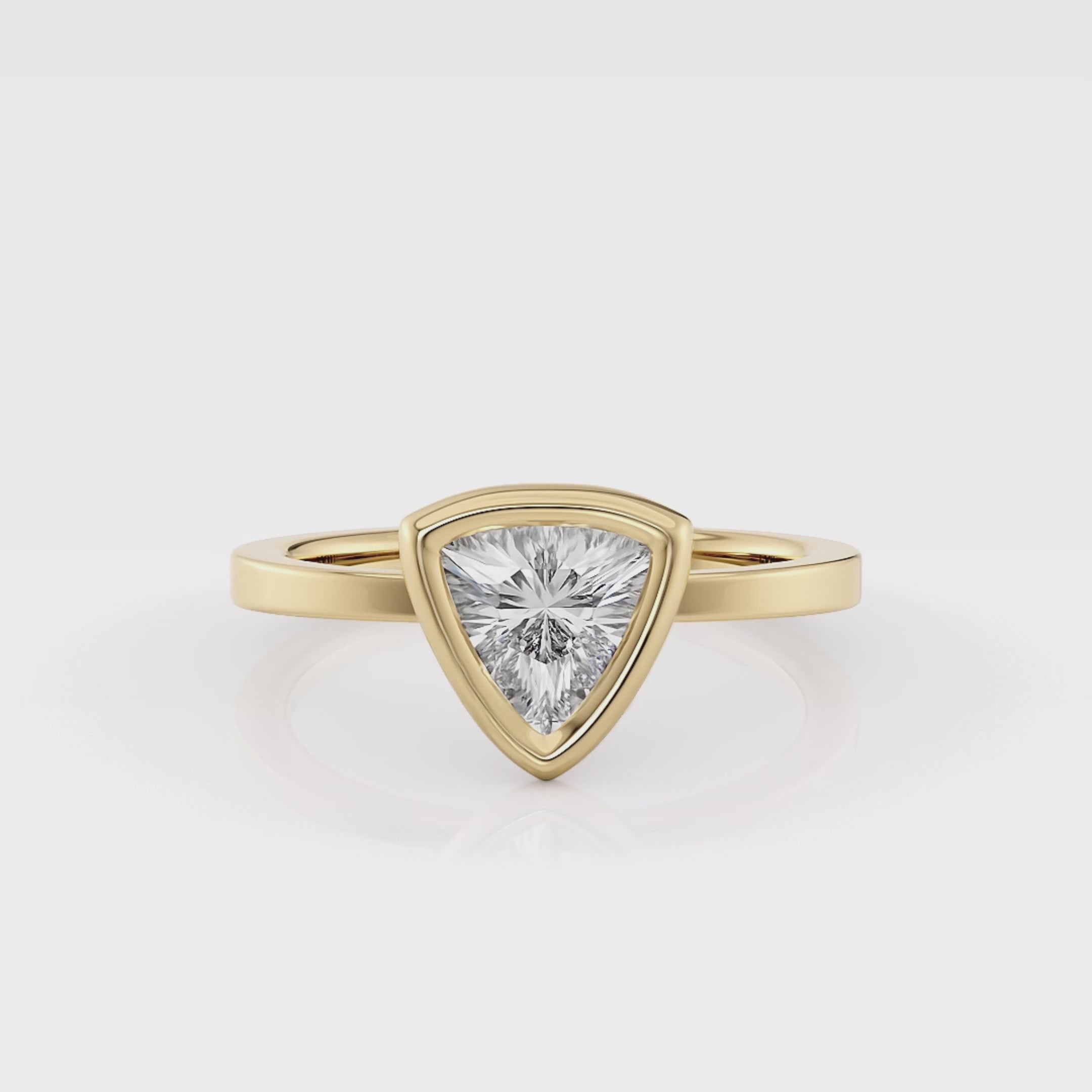 The Elara Ring features a stunning trillion-cut center diamond, bezel-set for a modern and minimalist solitaire design. With its timeless beauty and ethical craftsmanship, this ring is a symbol of enduring love and ethical excellence.