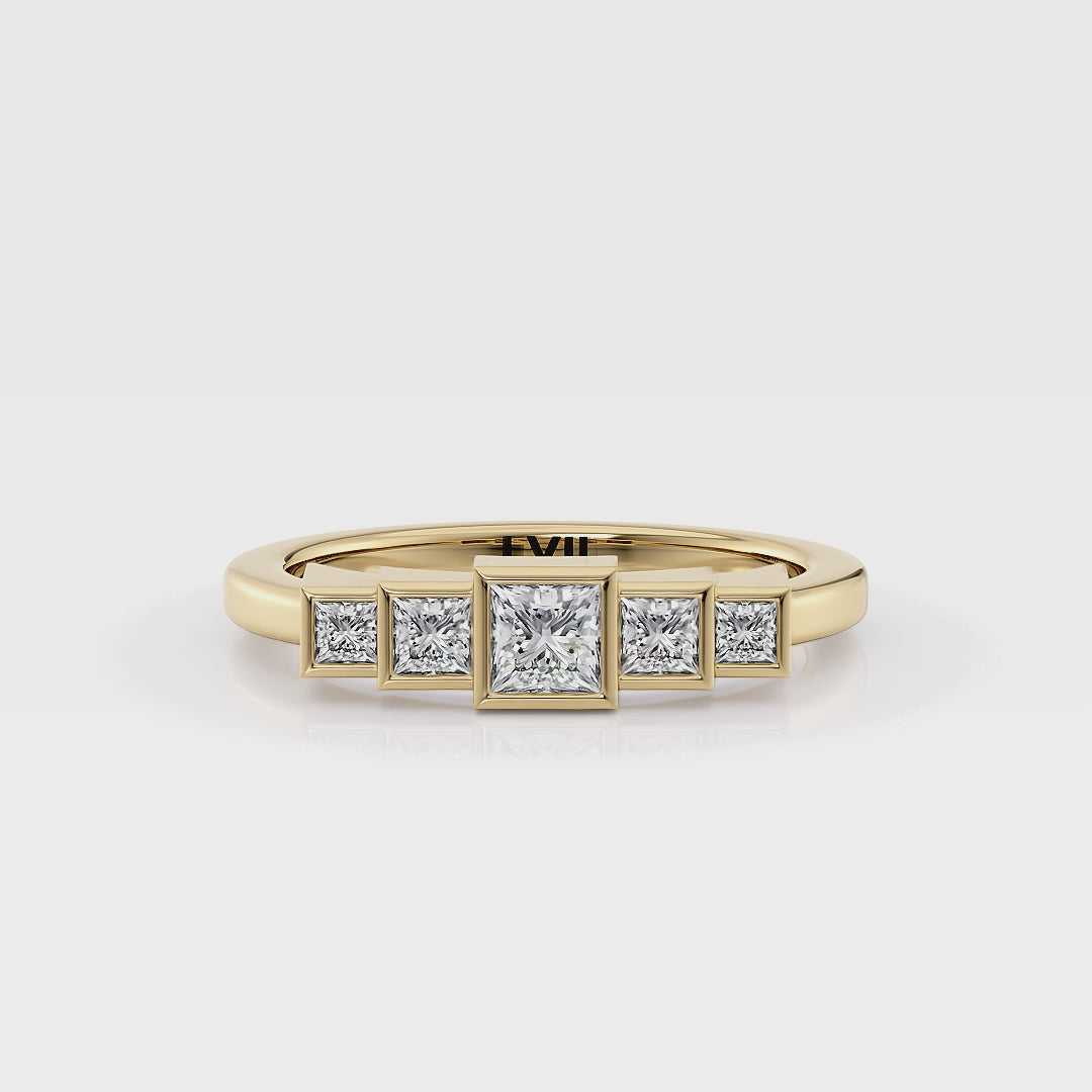 Embark on a journey of Regal Romance with our exquisite collection of dainty artisanal lab grown diamond rings, inspired by the Art Deco engagement rings era. Meet the "Imogen Ring," a captivating masterpiece featuring a princess-cut center stone and four additional stones, all set in an elegant five-stone ring design. With its sharp edges and Art Deco influence, this ring exudes sophistication and timeless allure. Each ring in our collection is meticulously crafted with ethically sourced lab diamonds, symbolizing both style and conscience. Elevate your love story with the "Imogen Ring," a true reflection of refined taste and regal elegance. Immerse yourself in the romance of the "Imogen Ring" and experience the timeless allure of Art Deco-inspired design.