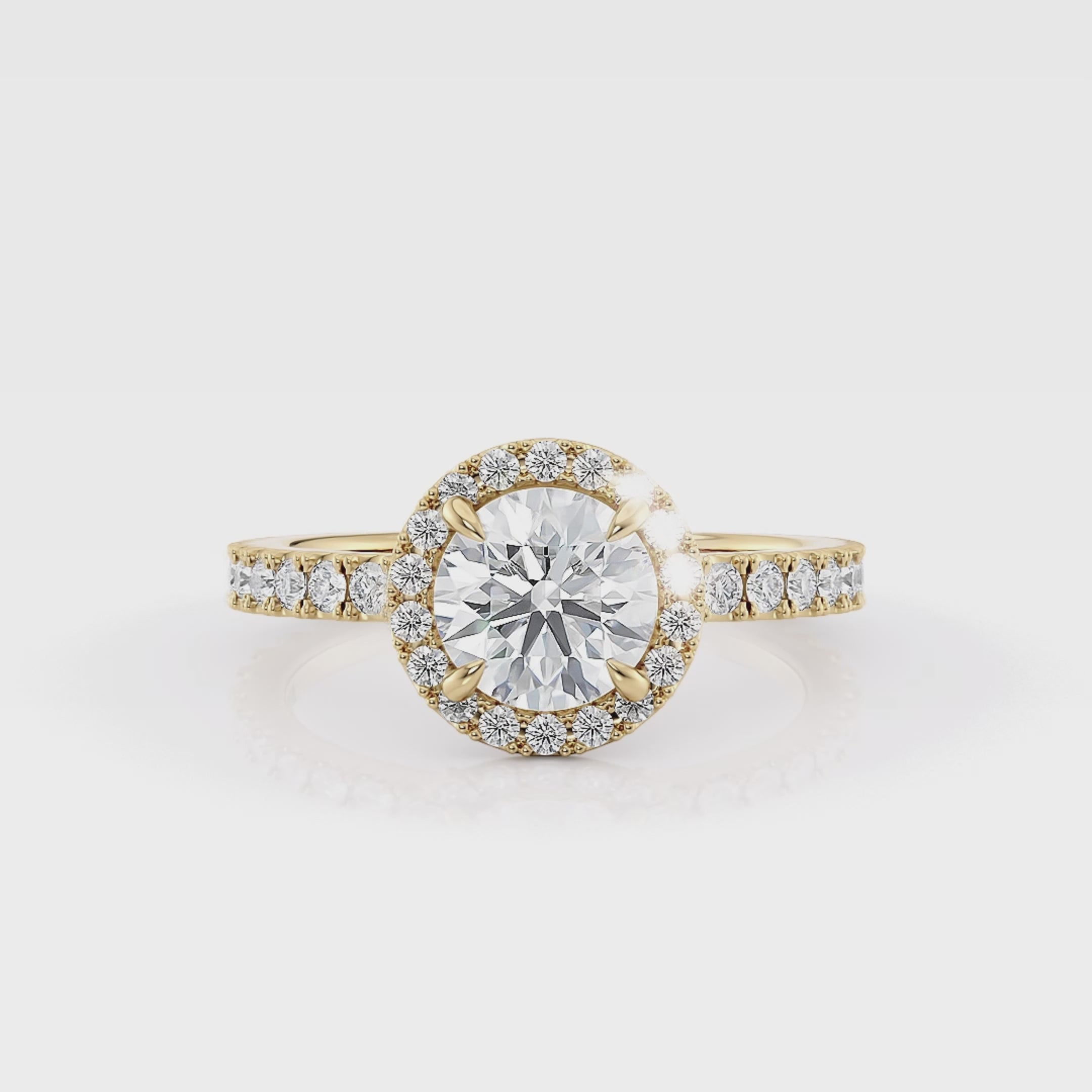 A classic round diamond halo engagement ring perfect for a timeless look.