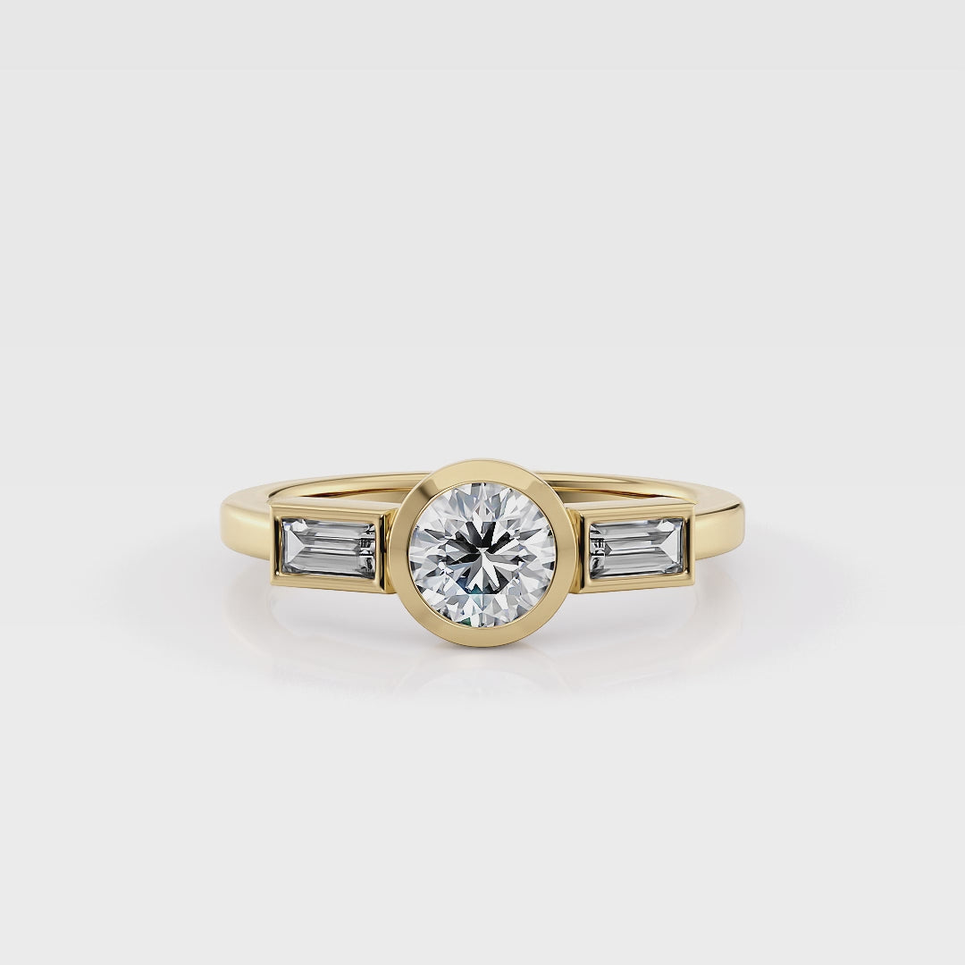 Experience ethical charm with our dainty handcrafted lab grown diamonds engagement ring collection, inspired by the Art Deco era. Introducing the "Marigold Ring," a mesmerizing beauty adorned with bezel-set lab diamonds and baguette side stones. Each ring in our collection is meticulously crafted to evoke the elegance and glamour of the Art Deco period. With its delicate design and intricate details, the "Marigold Ring" exudes timeless allure and sophistication. Meticulously crafted with ethically sourced lab diamonds, this ring symbolizes both style and conscience. Elevate your love story with this exquisite piece, a true reflection of refined taste and ethical elegance. Immerse yourself in the charm of the "Marigold Ring" and experience the timeless allure of Art Deco-inspired design.