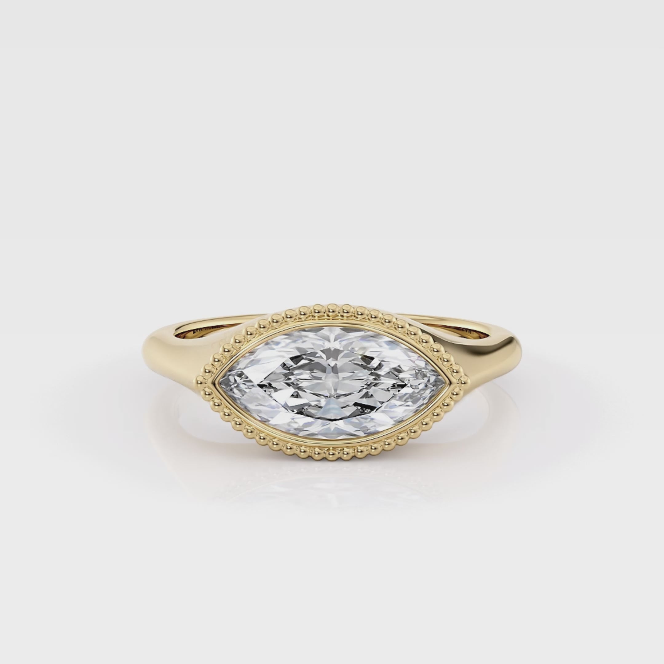 The Celeste Ring features an east-west marquise-set solitaire design, adorned with delicate millgrain detailing that evokes the late Victorian era. With its vintage-inspired charm and solitaire simplicity, this ring captures the essence of timeless beauty and sophistication.
