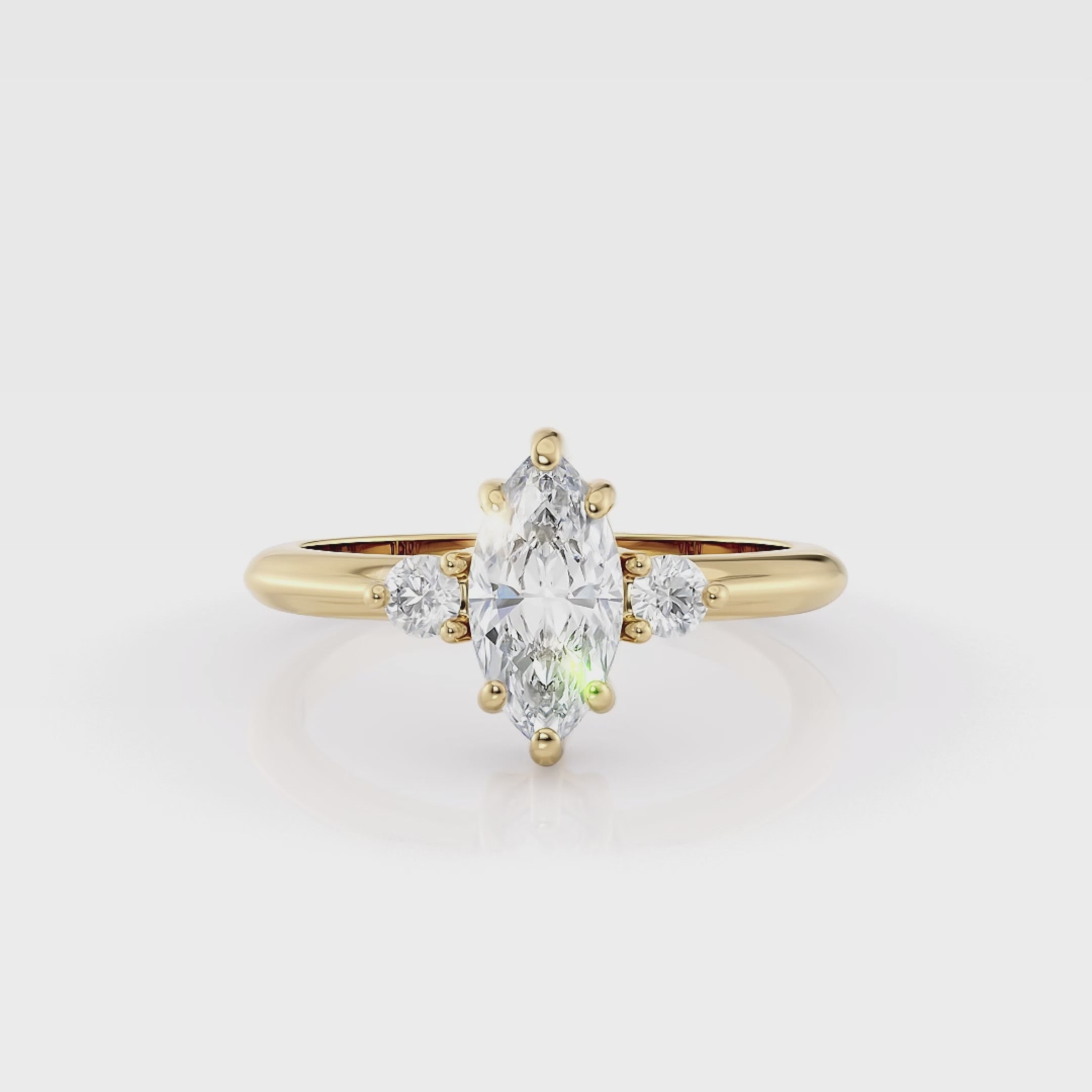 The Adaline Ring features a captivating marquise center stone, flanked by two smaller stones, creating a classic three-stone ring design. With its art deco feel and clean lines, this ring is a tribute to vintage glamour and timeless beauty.