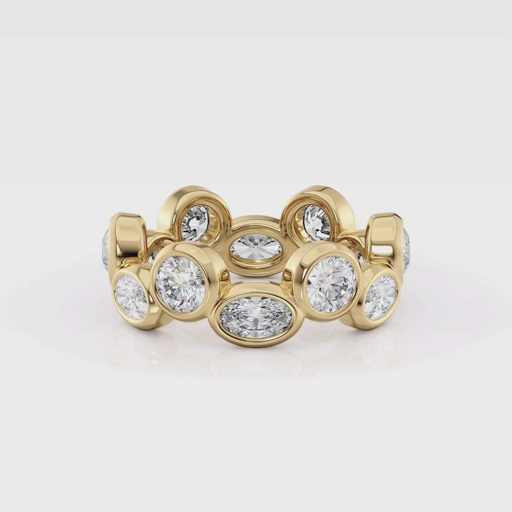 Introducing The Chicago Wedding Band – a symbol of urban chic and timeless style. Inspired by the dynamic energy of the Windy City, this diamond eternity band boasts a unique mix of oval and round-cut lab-grown diamonds, set in bezels for a modern and sophisticated look.