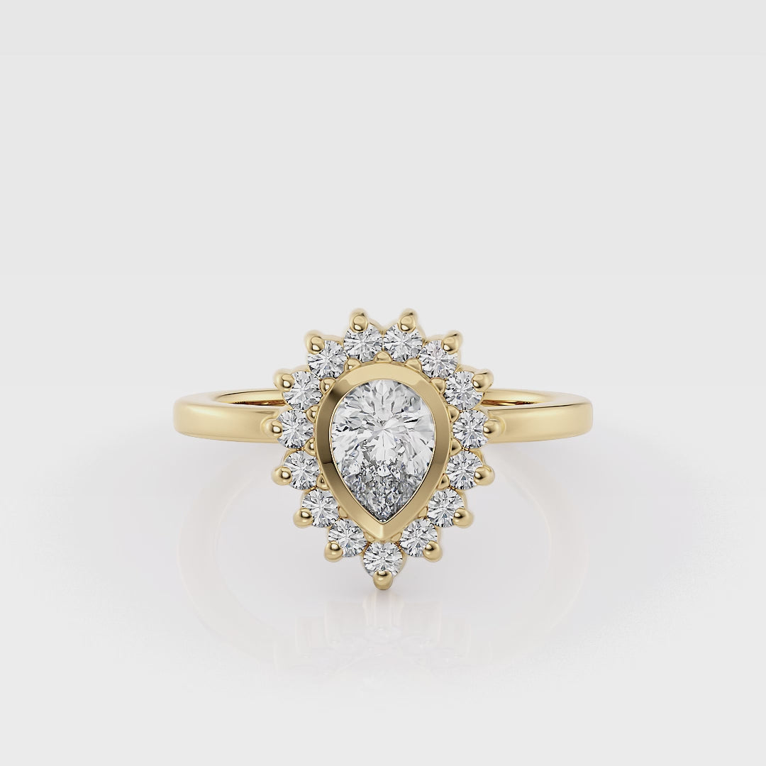 Step into the Royal Essence with our collection of dainty artisan vintage-inspired lab grown diamond rings. This pear shaped engagement ring the "Octavia Ring," a masterpiece of understated beauty featuring a beautiful diamond surrounded by a delicate diamond halo. Its minimal and simple design exudes timeless elegance and sophistication. Each ring in our collection is meticulously crafted with ethically sourced lab diamonds, symbolizing both style and conscience. Elevate your love story with the "Octavia Ring," a true reflection of refined taste and regal allure. Immerse yourself in the vintage-inspired charm of the "Octavia Ring" and experience the timeless beauty of its unique design.