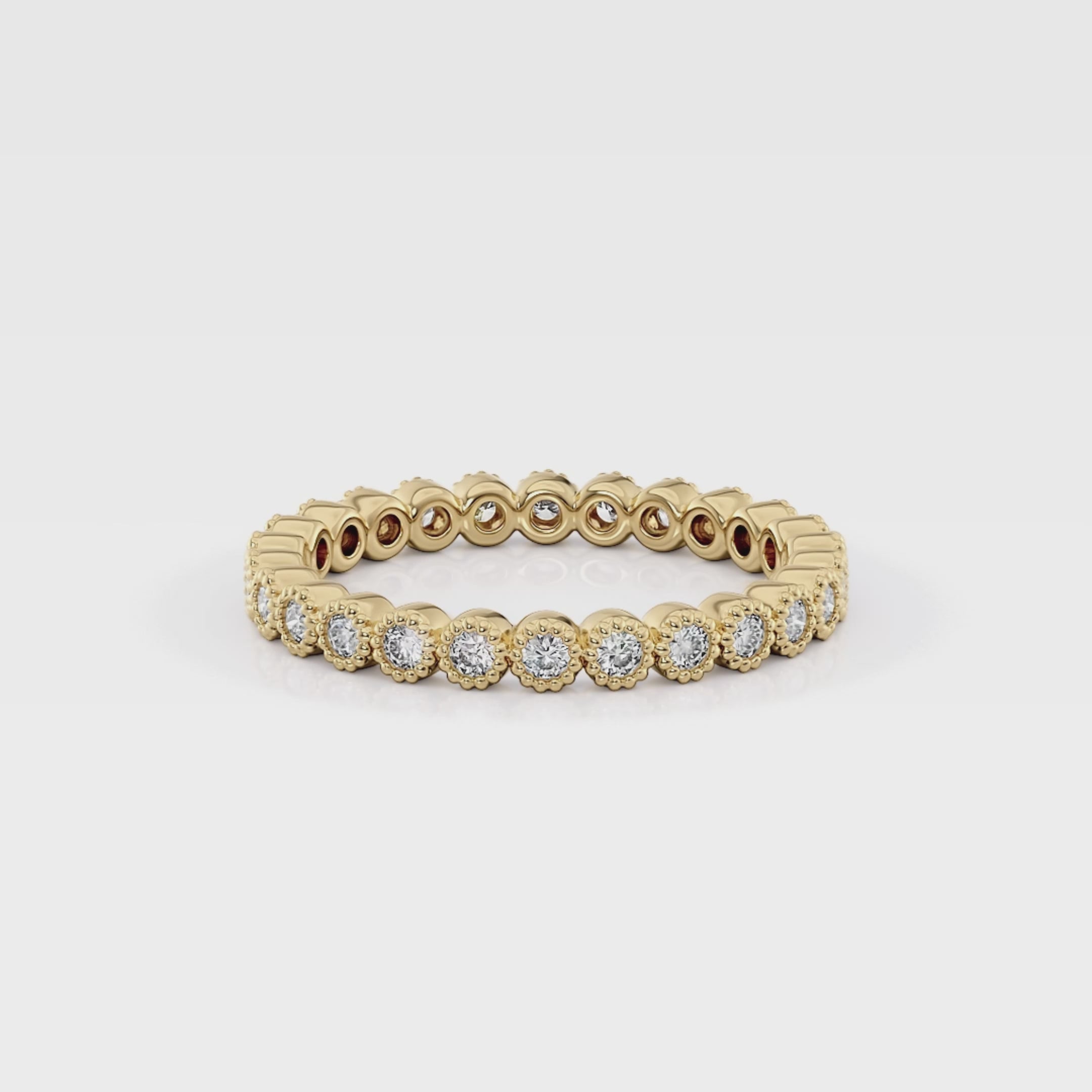Crafted with precision and care, each band features exquisite milgrain detailing that enhances the brilliance of the diamonds, creating a mesmerizing display of sparkle and shine. The continuous circle of diamonds symbolizes eternal love, making this band a timeless symbol of your devotion.