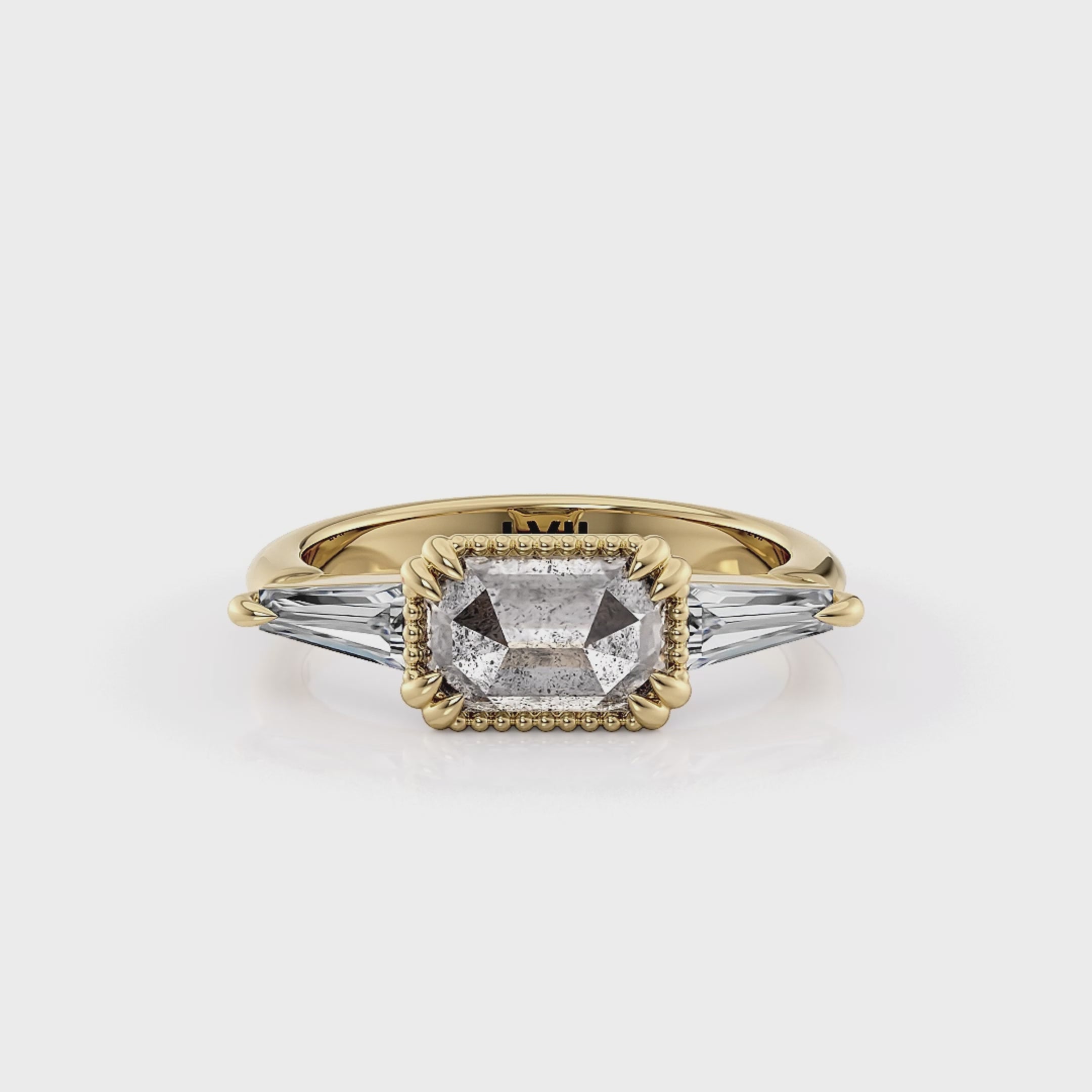 Immerse yourself in the enchanting allure of whimsical vintage charm with our collection of salt and pepper diamond engagement rings. Introducing the "Ivy Ring," a captivating embodiment of unique elegance and ethical artistry. Featuring an east-west emerald cut center stone, accentuated by side baguettes and delicate milgrain detailing, all set low for timeless sophistication. Crafted with ethically sourced diamonds, each ring in our collection tells a story of conscious luxury and individuality. Elevate your love story with the "Ivy Ring," a testament to your values and your commitment to ethically crafted beauty. Experience the magic of vintage-inspired design with a ring that whispers timeless charm and exquisite style.